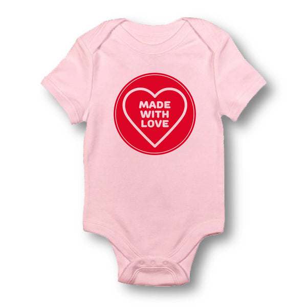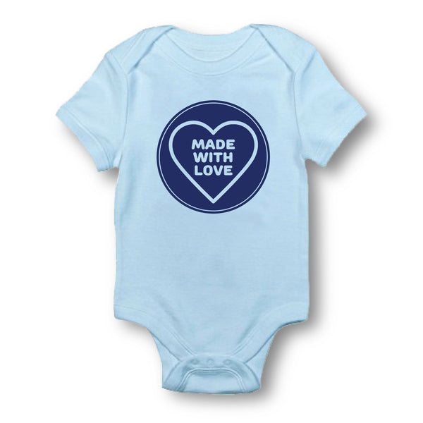 Taken from the retro sweets 'Love Hearts' the Made with Love design in popular with the little man and little lady in your life.
